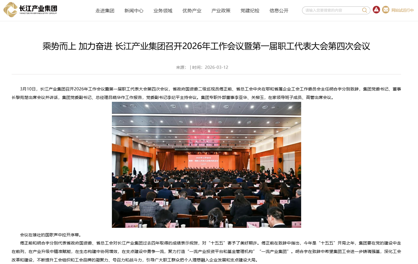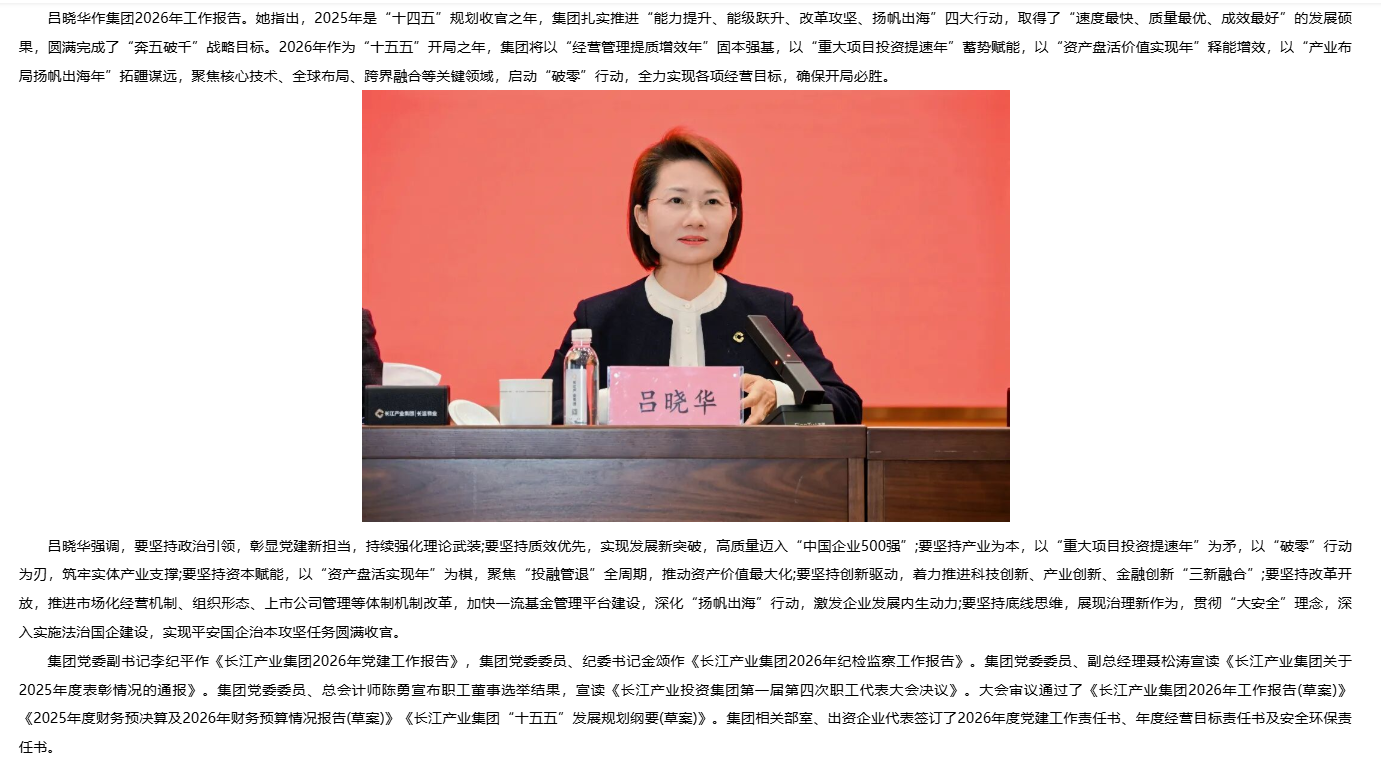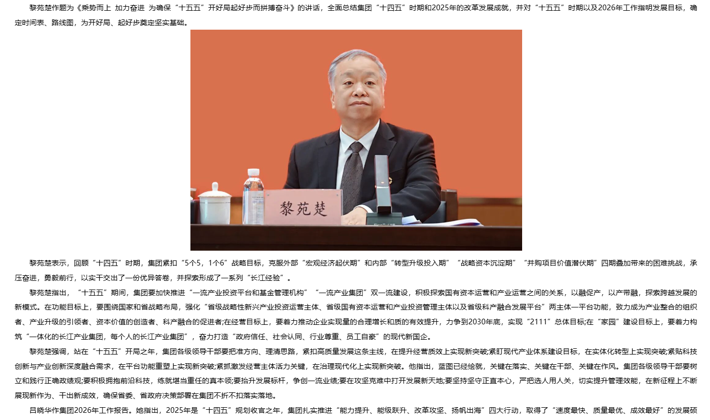 乘勢而上 加力奮進(jìn) 長江產(chǎn)業(yè)集團(tuán)召開2026年工作會議暨第一屆職工代表大會第四次會議 [2026/03/12]