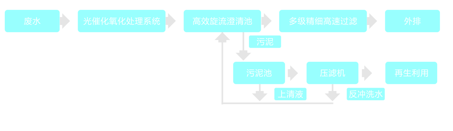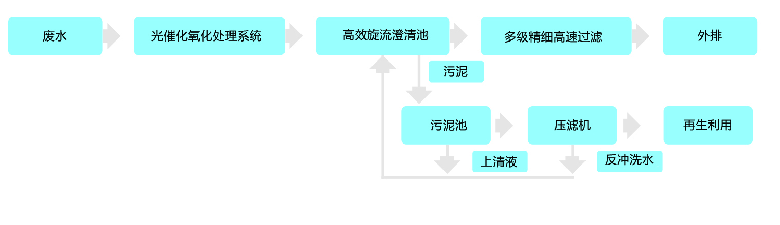 油田采油回注水進(jìn)入光催化氧化處理系統(tǒng),利用光催化改性陶瓷介質(zhì)作為載體,以可見光為光源,提高活性極強(qiáng)的羥基自由基的產(chǎn)率,通過(guò)羥基自由基與廢水中有機(jī)物的加成、取代、電子轉(zhuǎn)移等反應(yīng)使大部分有機(jī)污染物礦化為二氧化碳、水等簡(jiǎn)單無(wú)機(jī)物。出水再進(jìn)入高效旋流澄清池,投加改性淀粉絮凝劑,使池中形成活性油渣層,強(qiáng)化廢水中細(xì)小油粒與活性油渣層內(nèi)較大油滴的接觸絮凝過(guò)程,從而高效除油。同時(shí)在裝置進(jìn)水區(qū)設(shè)計(jì)出獨(dú)特的喉管混合結(jié)構(gòu),使池中形成小而密實(shí)的絮凝體,提高旋流澄清池的絮凝效率。出水經(jīng)輻射式多級(jí)精細(xì)高速過(guò)濾器處理后可達(dá)標(biāo)外排。