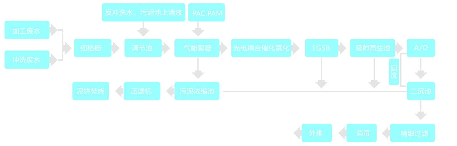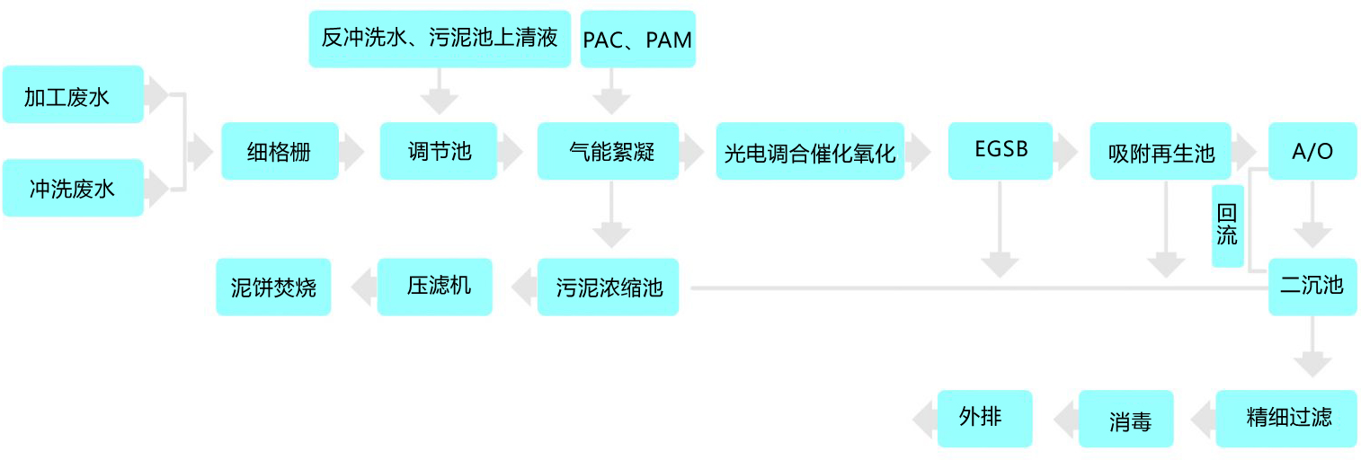 加工廢水和沖洗廢水混合經(jīng)細(xì)格柵去除大的浮渣后進(jìn)入調(diào)節(jié)池,投加絮凝劑后提升至氣能絮凝池以去除污水中的懸浮物及油脂。出水進(jìn)入三維粒子光電耦合催化氧化反應(yīng)器,以可見(jiàn)光為光源,通過(guò)羥基自由基與廢水中高濃度的有機(jī)物的加成、取代、電子轉(zhuǎn)移等反應(yīng)使大部分污染物轉(zhuǎn)化為二氧化碳、水等簡(jiǎn)單無(wú)機(jī)物,從而提高廢水的可生化性。出水提升到EGSB反應(yīng)器進(jìn)行厭氧反應(yīng),大大降低COD負(fù)荷,然后經(jīng)吸附再生池提高其生物活性后進(jìn)入A/O系統(tǒng),通過(guò)缺氧段和好氧段的交替運(yùn)行高效脫氮。出水進(jìn)入二沉池固液分離,其上清液經(jīng)精細(xì)過(guò)濾系統(tǒng)、消毒后外排。