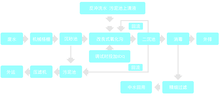 廢水經(jīng)機(jī)械格柵截留大塊飄浮物后進(jìn)入沉砂池,去除較大無機(jī)顆粒物。出水以兩點進(jìn)水的方式進(jìn)入改良式氧化溝,通過控制三點污泥回流的分配比來調(diào)整不同反應(yīng)區(qū)的C/N、C/P之比,并利用專有SBQ菌高效去除COD及脫氮除磷,出水進(jìn)入二沉池進(jìn)行泥水分離,上清液經(jīng)消毒后達(dá)標(biāo)外排,或經(jīng)精細(xì)過濾后作為中水回用。