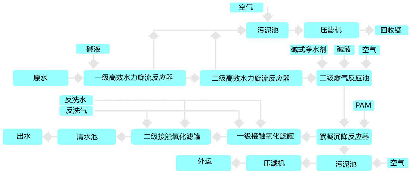 原水進入兩級高效水力旋流反應(yīng)器,在進水管道前投加藥劑調(diào)節(jié)PH值,在反應(yīng)器內(nèi)形成初級懸浮態(tài)水合錳氧化物,并在錐形分離區(qū)初步實現(xiàn)固液分離,上清液進一步調(diào)節(jié)pH,充分曝氣后,水中殘余的錳離子轉(zhuǎn)化成水合MnO2及Mn(OH)2,在絮凝沉降反應(yīng)系統(tǒng)內(nèi)再次固液分離。出水經(jīng)二級“活性濾膜”自催化系統(tǒng)精細(xì)過濾,達(dá)到設(shè)計標(biāo)準(zhǔn)(錳≤2mg/L、鐵≤1mg/L)。
